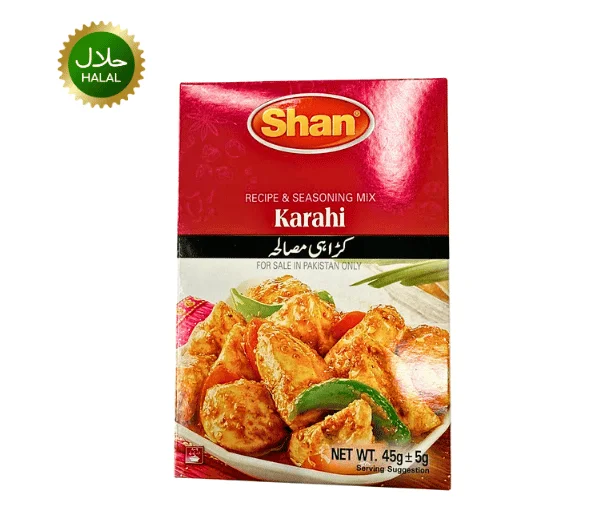 Shan Karahi Recipe Mix 45g – Specially blended spices to prepare traditional, aromatic, and flavorful Karahi dishes effortlessly.